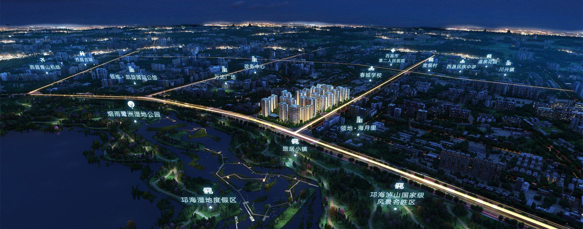 择址航天大道沿线,充分发挥项目所在区域、人文、生态资源等多重优势,打造 专属百亩资源豪宅,集合现代美学和自然美学,极致享受揽山阅海,成就无敌山 海视野,敬献自然高奢的生活方式。